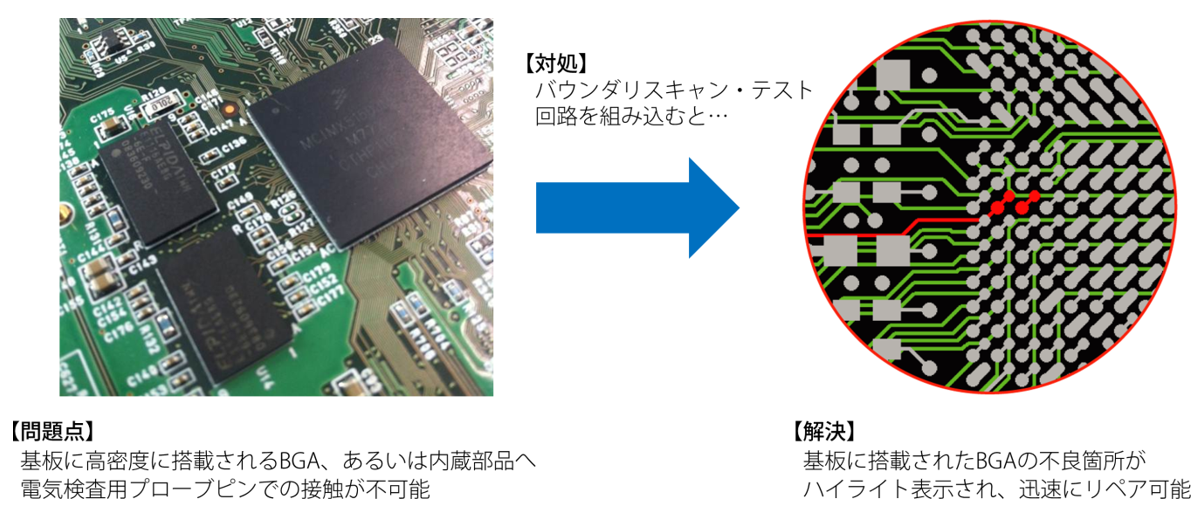 自動車の電動化などに伴い、部品内蔵基板やBGA/CSP搭載基板のような高密度な基板では、今までのようにボード検査のための検査パッドを設けることが難しくなったことから、既存の外部コネクタから検査したいという要望が挙がっています。その解決方法としてBSがあり、設計部門と検査部門とが連携することにより、効率良くBSテストができる様々なソリューションが提供されています。