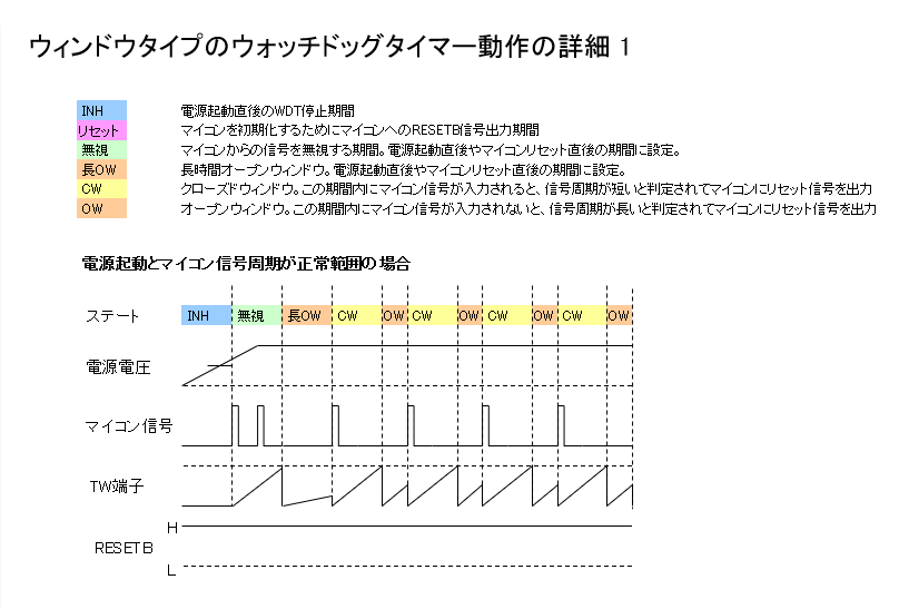 信号周期が短い場合にはクローズドウィンドウ期間にマイコンから信号が来ることでRESETB信号を送出し、信号周期が長い場合にはオープンウィンドウ期間にマイコンからの信号が来ないためタイマーがオーバーフローしてRESETB信号を送出する様子を示しています。 なお、RESETB信号によってマイコンが初期化された直後は電源起動直後と同様にマイコンからの信号を無視する期間とマイコンからの信号周期が長くなって正常動作と判定できるようにオープンウィンドウの期間を通常より長く設定します。